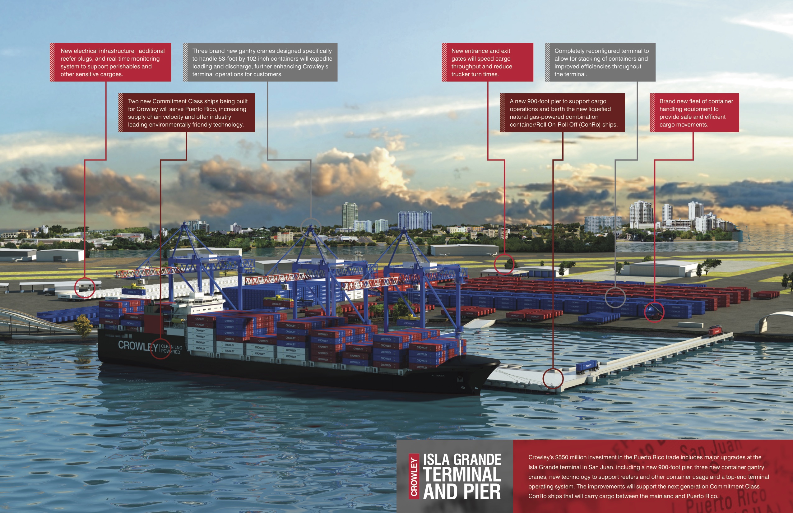 Other improvements include developing the new 900-foot-long, 114-foot-wide concrete pier and all associated dredging needed to accommodate Crowley’s two new ships; expanding the terminal’s capacity for handling refrigerated containers; paving 15 acres to accommodate container stacking; adding containers to its fleet and container handling equipment; installing a new electrical substation to provide power for the new gantry cranes; constructing a new seven-lane terminal exit gate for increased efficiency; and installing hardware for a new, state-of-the-art terminal operating software system.
